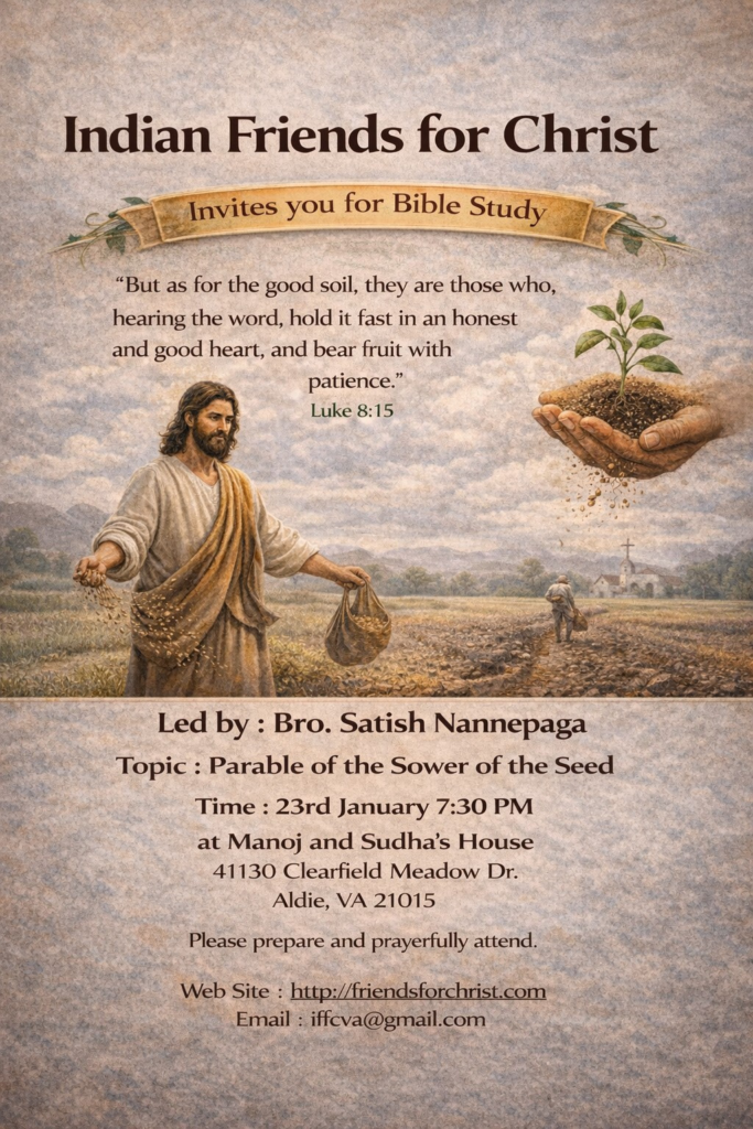Friday 23rd January 7:30 PM – IFFC Bible Study @Manoj and Sudha’s house